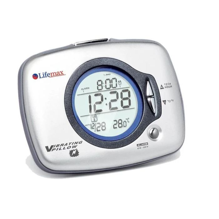 Ideal for users that are hard of hearing this alarm clock vibrates under your pillow. The screen also shows the temperature and the date. Compact and lightweight, it's perfect for travel.